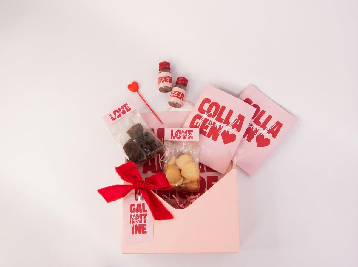 Kit for two, including: brownie cubes, mini cookies, 2 collagen face masks, and 2 ginger shots.