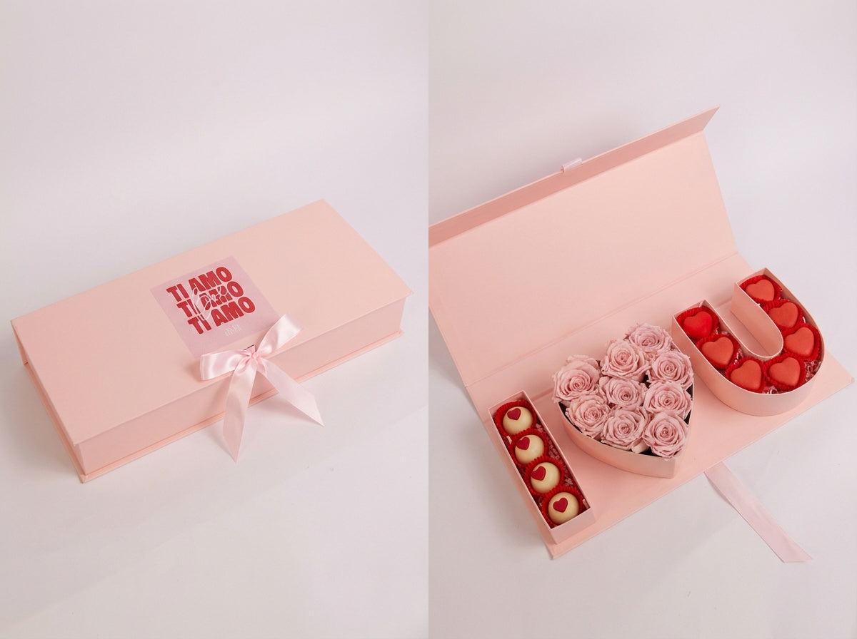 4 handcrafted pralines decorated with white chocolate and cherry, a bouquet of fresh roses, and 7 heart-shaped macarons with chocolate and salted caramel filling.