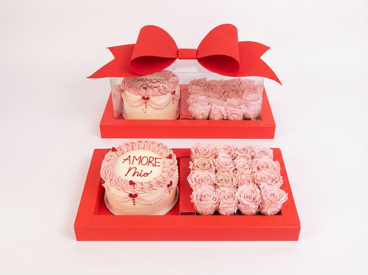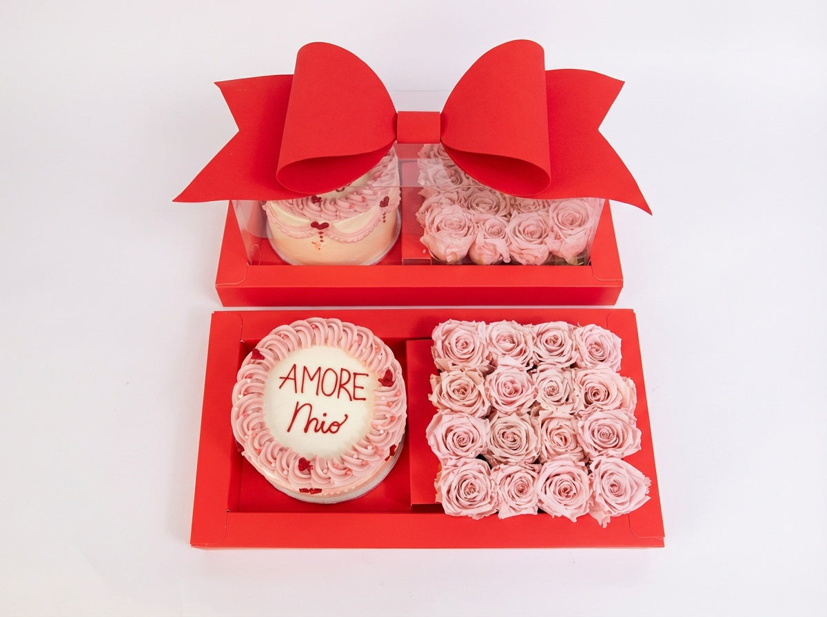 Transparent box with cardboard tray (45 × 22 × 22 cm) and bow.